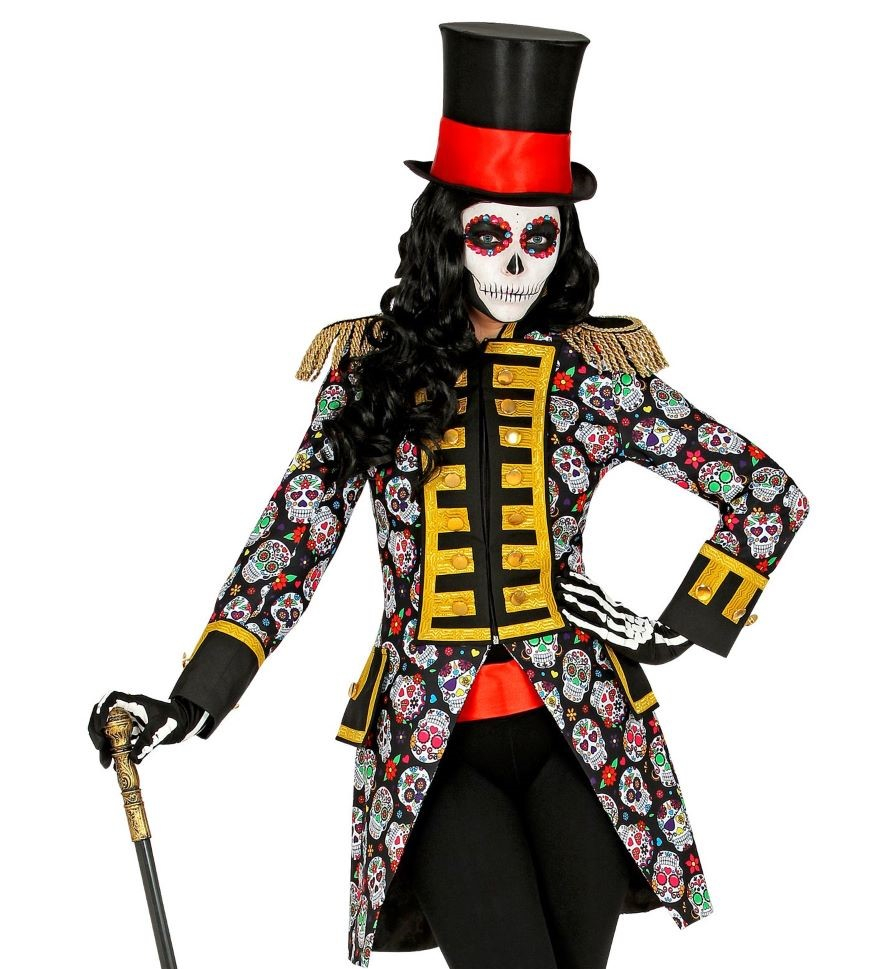 Jakken er pyntet med de farverige sugar skulls og pyntet med store skulderpuder og smukke guld detaljer.