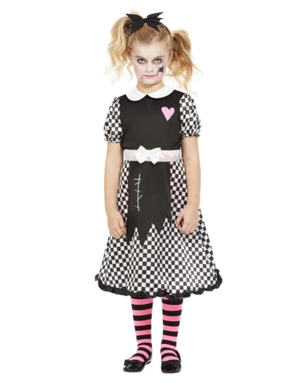 Bliv en creepy lille horror doll til halloween festen ved hjælp af denne sort og hvid ternet dukke kjole.
